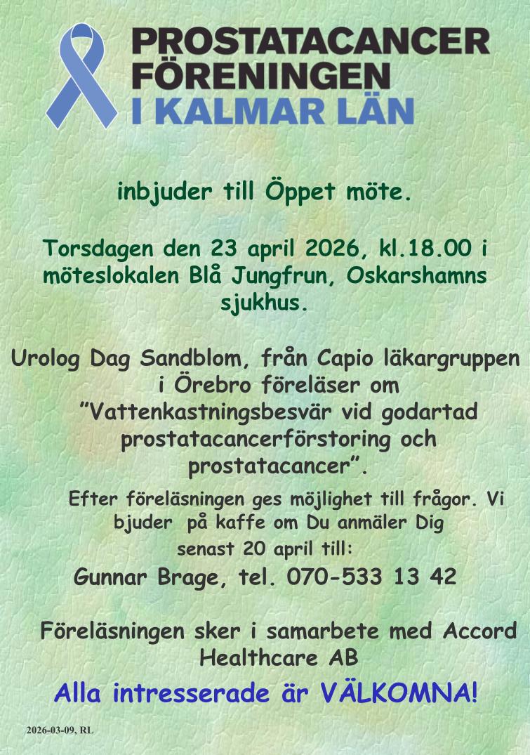 Västervik 2026-04-15. Hej medlem! Medlemsbrev 3/2026. Nu återkommer vi med påminnelse om kommande program. Den 23 april kl. 18.00 har vi bjudit in urolog Dag Sandblom från Capio läkargruppen i Örebro, som ska föreläsa om ”Vattenkastningsbesvär vid prostatacancer”. Föreläsningen sker i möteslokalen Blå Jungfrun i Oskarshamns sjukhus. Se nästa sida. Anmäl er så fort som möjligt till Gunnar Brage! Kommunalrådet Harald Hjalmarsson är inbjuden till ett infomöte på Rest. Blåklinten, Västerviks sjukhus 12 maj kl. 18.00. Anmäl er till Gunnar Brage. Vi bjuder som vanligt på kaffe och mackor. Välkomna! PCF i Kalmar län Styrelsen 2026-04-15, RL